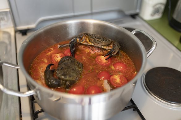 Dugootočani su mi rekli da je bolji način pripreme na hladno, pa sam poslušao savjete i na oko kilogram narezanog luka poslagao sam više od dva kilograma ribe i rakova, te sve zalio sa oko dva decilitra maslinovog ulja. Dodao sam sitno sjeckana 4 režnja češnjaka, malo krupne morske soli, peršina, grančicu ružmarina, malo bosiljka, te sve zalio sa sitno sjeckanim pelatima i rajčicom, vodom, vinom, te par žlica domaćeg vinskog octa. Tekućine treba biti taman da prekrije ribu i rakove.